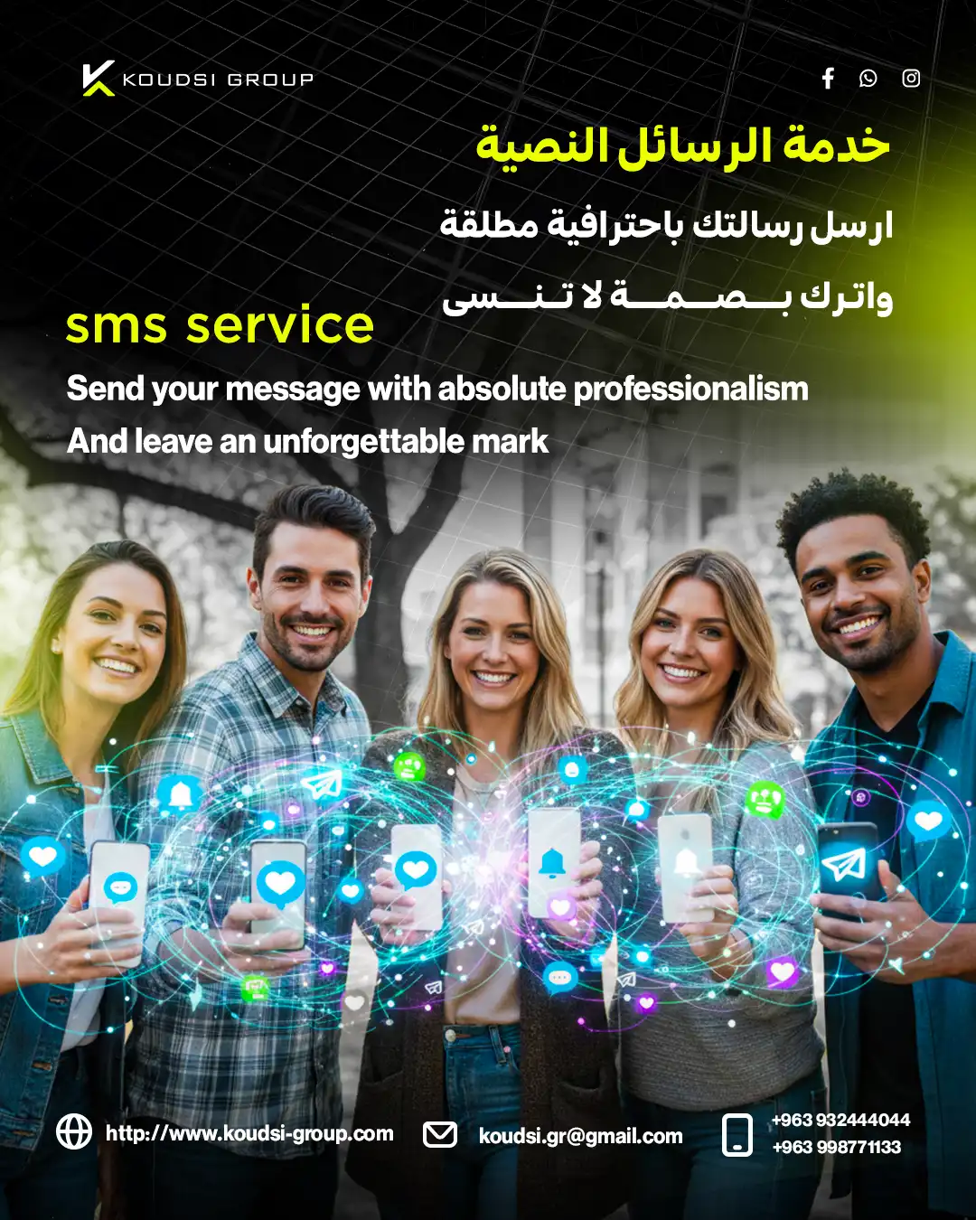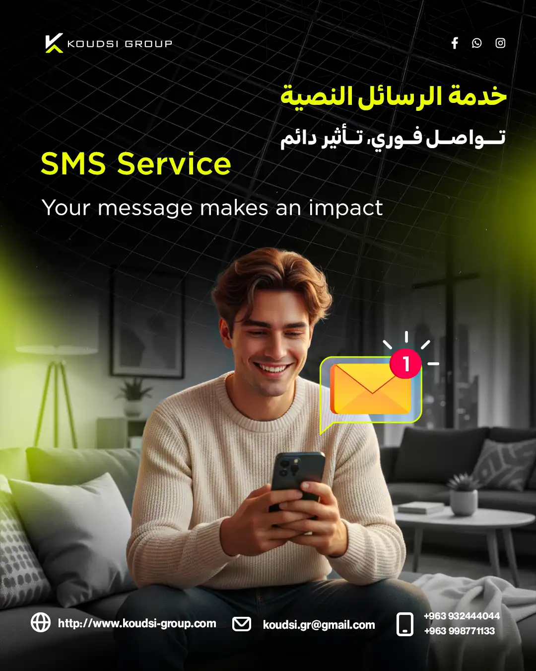 At Koudsi Group, we provide direct, fast, and highly targeted SMS Marketing campaigns through Syriatel and MTN—the two leading telecom operators in Syria. Our SMS solutions help businesses reach customers instantly with high delivery rates and measurable results.